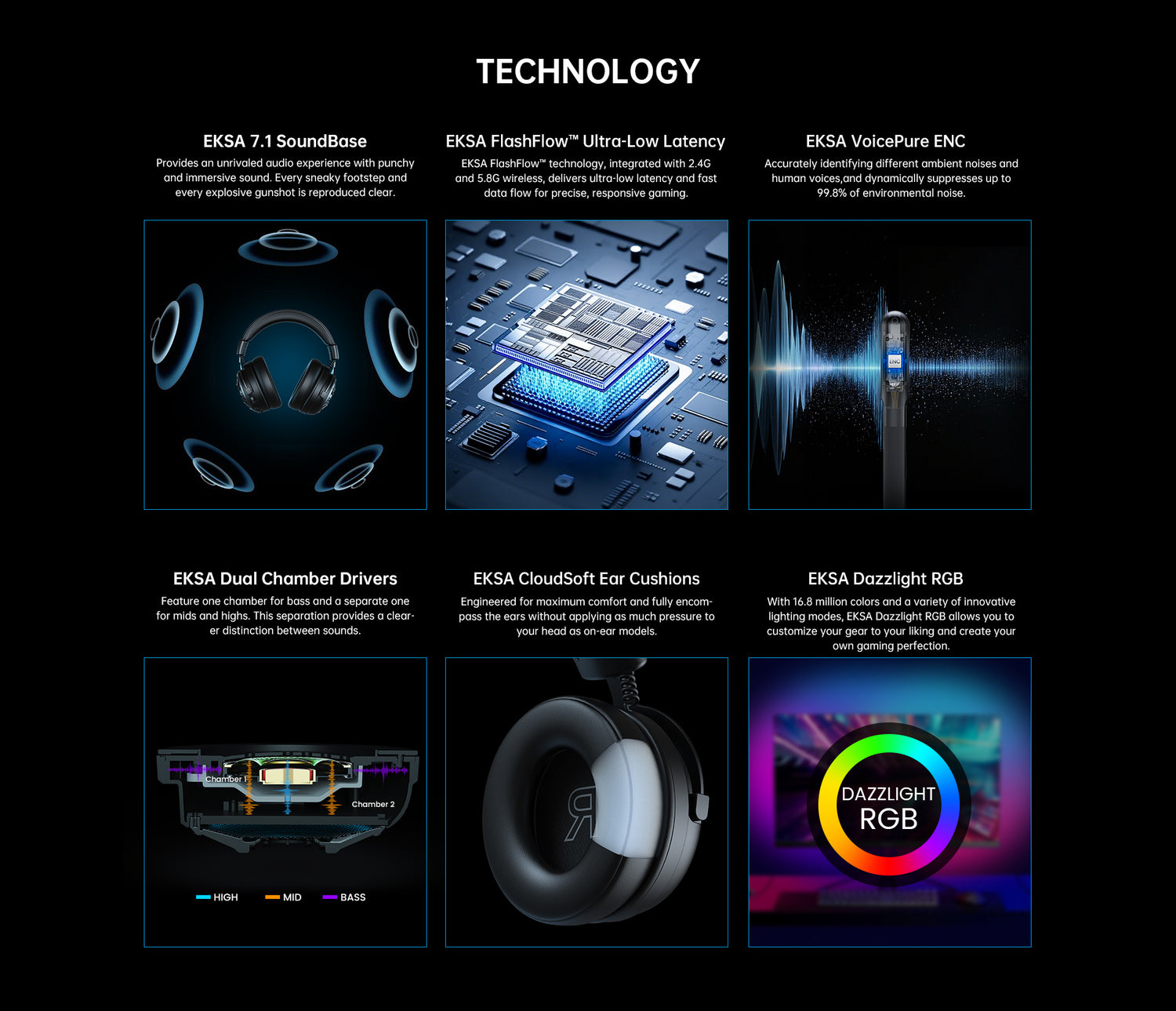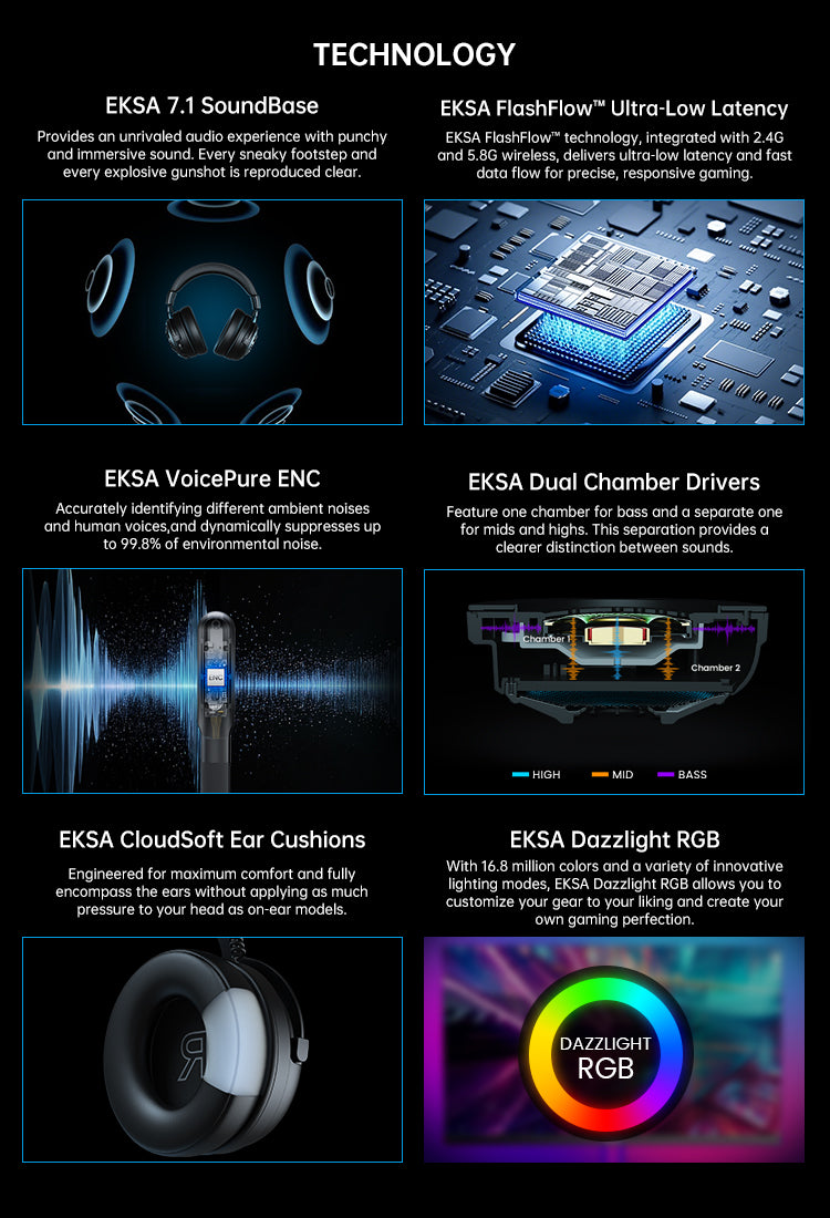 EKSA embraced "black technology" to push innovation boundaries, featuring the groundbreaking 7.1 SoundBase technology for impressive surround sound. EKSA valued aesthetics, ensuring its products reflected style and sophistication. Every detail mattered, enhancing the experience from unboxing to victory as EKSA aimed to be one of the world's leading esports brands.